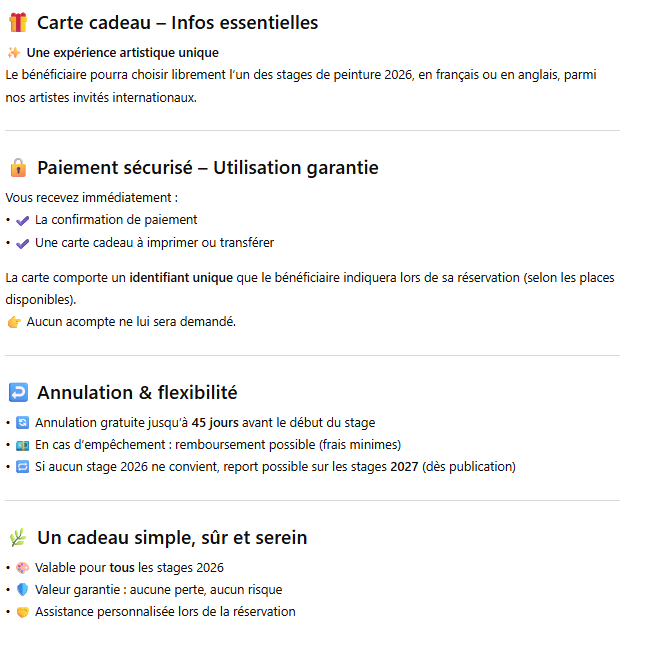 2. Vous pouvez annuler votre réservation sans frais jusqu'à 45 jours avant le stage, soit en utilisant le lien de gestion de votre réservation, soit en nous contactant. Nous vous rembourserons sur la même carte.